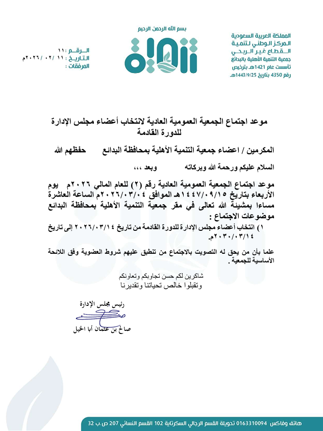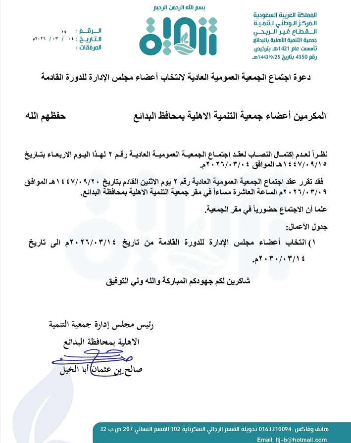 فتح باب الترشح لعضوية مجلس إدارة جمعية التنمية الأهلية بمحافظة البدائع للدورة القادمة