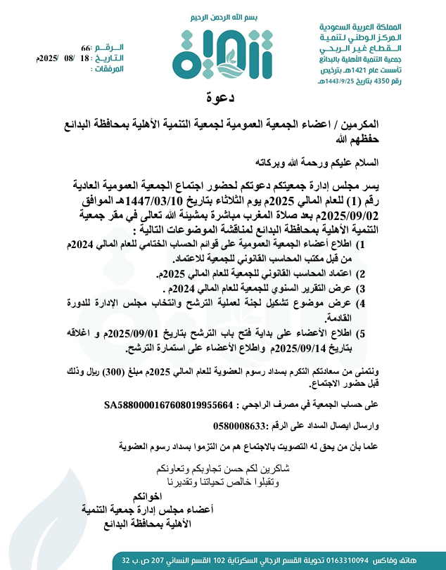 تاريخ الخبر 18/08/2025م يسر مجلس إدارة جمعية التنمية الأهلية بالبدائع دعوة أعضاء الجمعية لحضور اجتماع الجمعية العمومية العادية رقم (1) للعام المالي 2025م يوم الثلاثاء بتاريخ 10/03/1447هـ الموافق 02/09/2025م بعد صلاة المغرب مباشرة بمشيئة الله تعالى في مقر جمعية التنمية الأهلية بمحافظة البدائع لمناقشة الموضوعات التالية : 1) اطلاع أعضاء الجمعية العمومية على قوائم الحساب الختامي للعام المالي 2024م من قبل مكتب المحاسب القانوني للجمعية للاعتماد. 2) اعتماد المحاسب القانوني للجمعية للعام المالي 2025م. 3) عرض التقرير السنوي للجمعية للعام المالي 2024م . 4) عرض موضوع تشكيل لجنة لعملية الترشح وانتخاب مجلس الإدارة للدورة القادمة. 5) اطلاع الأعضاء على بداية فتح باب الترشح بتاريخ 01/09/2025م و اغلاقه بتاريخ 14/09/2025م واطلاع الأعضاء على استمارة الترشح.