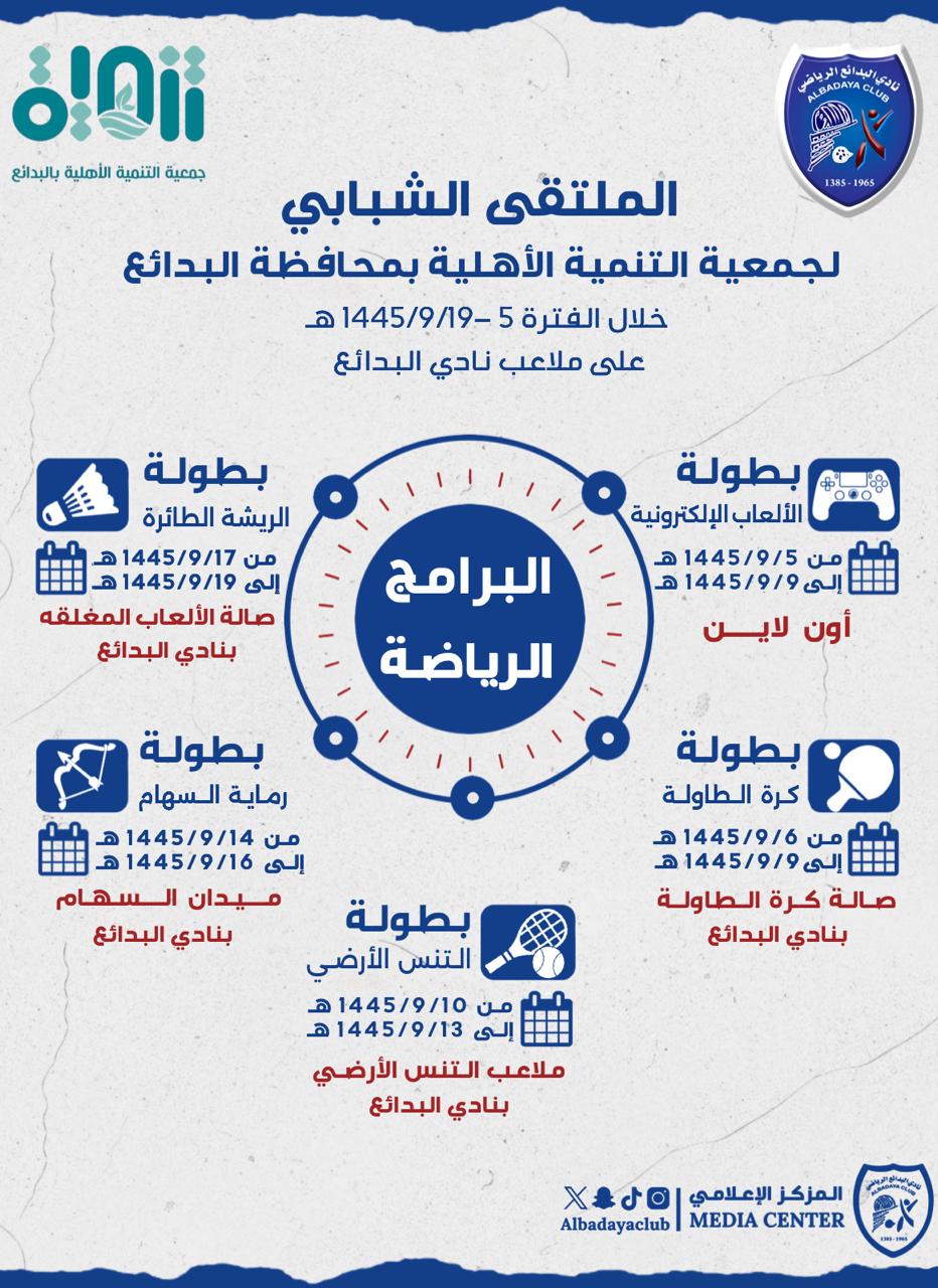 تعتزم جمعية التنمية الاهلية بمحافظة البدائع بإقامة برنامج الملتقى الشبابي بالشراكة مع نادي البدائع الرياضي خلال شهر رمضان المبارك أعاننا الله واياكم على صيامه وقيامه بتاريخ 1446/09/05هجري