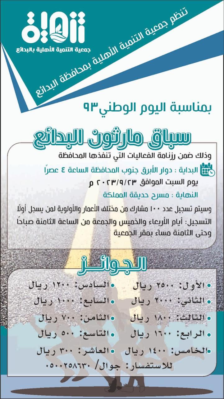 تنظم جمعية التنمية الأهلية بمحافظة البدائع سباق ماراثون البدائع وتدعوا الجمعية الراغبين بالمشاركة بتعبئة الرابط المرفق حيث يوجد جوائز قيمة تفاصيل إضافية من خلال الصورة المرفقة رابط التسجيل https://docs.google.com/forms/d/e/1FAIpQLSevyBWlOWdSb_OecgDChvF_TbxQ1_tiJl4kytRXFGp33XTDaw/closedform
